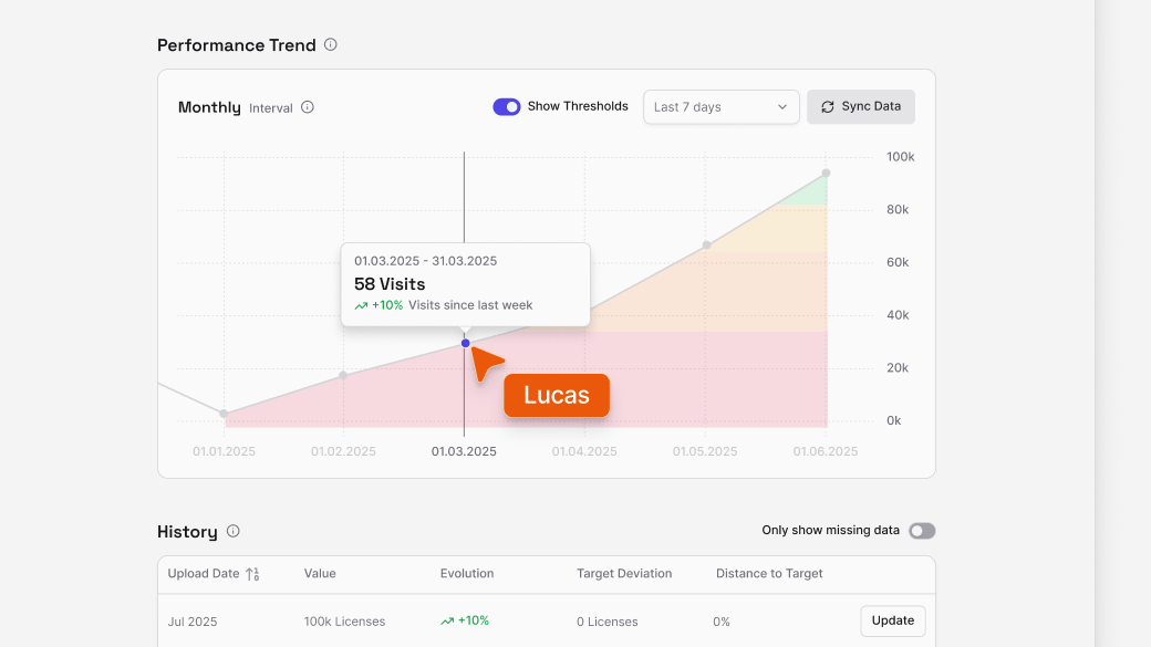 Every KPI now comes with its own historical timeline. All updates are stored automatically and displayed as a dynamic trend curve across selected time periods. See long-term developments, track the impact of strategic changes, and visualize progress directly within your impact chain. In addition, you can now define precise percentage thresholds for each status level (critical, poor, moderate, good) and see them directly next to the KPI.