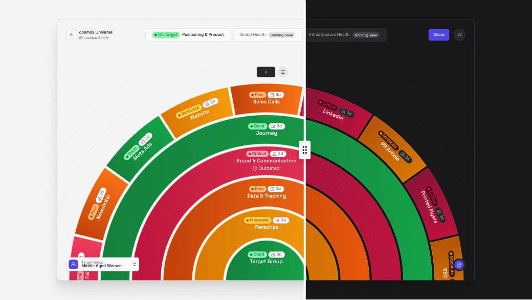Define exactly which data you need, where it comes from, and how often it refreshes – cosmos™ takes care of the rest. Your KPI cosmos becomes a living, self-updating ecosystem.